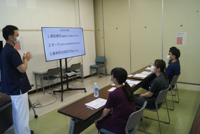 午前は座学、午後は実際に人工呼吸器を用いての実践研修です