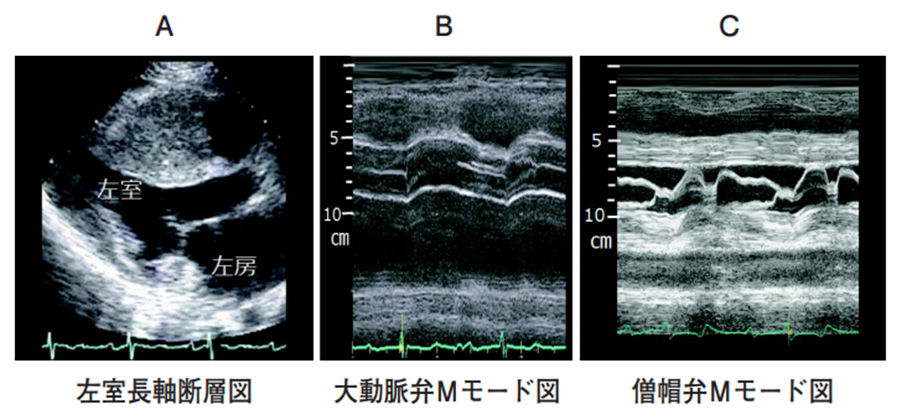 心エコーにおいて左室後壁に比べ、非対称性に肥厚した心室中隔(ASH)や僧帽弁前尖の収縮期前方運動(SAM)がみられる。