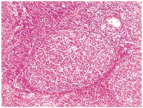42歳の男性。頸部のリンパ節腫大を主訴に来院した。数年前から風邪をひきやすいと感じていた。1年前から両側の頸部にリンパ節腫大を自覚していた。自宅近くの医療機関を受診したところ,右頸部リンパ節の生検で悪性腫瘍が疑われたため紹介されて受診した。両側の頸部に径3cmのリンパ節を数個触知する。右頸部に生検跡を認める。両側の腋窩に径2cmのリンパ節を1個触知する。脾を左肋骨弓下に3cm触知する。血液所見:赤血球302万,Hb 9.2g/dL,Ht 30%,白血球30,500(桿状核好中球3%,分葉核好中球3%,単球6%,リンパ球88%),血小板19万。リンパ節生検組織のH-E染色標本を別に示す。