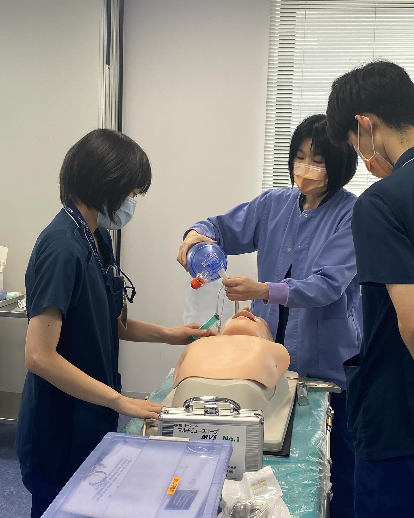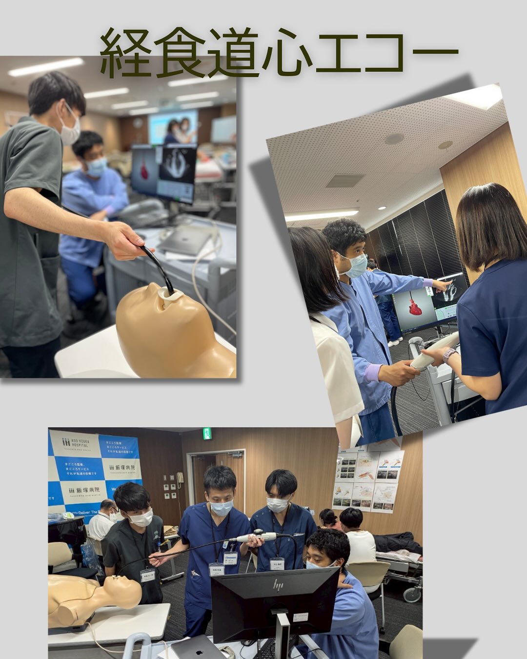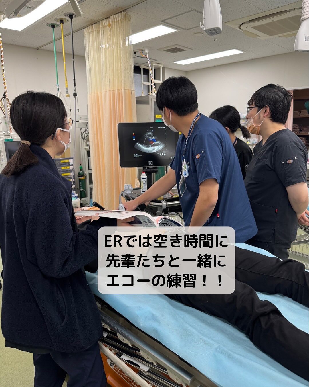遊んでばかりではありません🧑⚕️隙間時間も学習に貪欲なのが飯塚病院の研修医の特徴です。例えば、ERはエコーの機械が豊富にあるため、時間に余裕があるときには上級医の先生や先輩たちと、エコーの練習を行ったりしています。いつでも先輩や上級医の先生に気軽に質問できるのも飯塚病院のいいところです!同期同士でも、経験した症例やそこから学んだことなどをシェアしています🙌