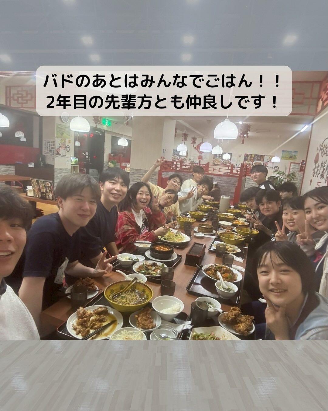 飯塚病院から車で10分くらいのところに、飯塚市総合体育館という綺麗な体育館があります✨その体育館で、先輩たちとバドミントンを楽しんでいます😊参加は任意ですが、経験者・未経験者ともに楽しめて運動不足の解消にぴったり!ということで、多くのひとたちが参加しました🏸いい汗をかいた後はみんなでご飯を食べに行って、その様子は部活そのもの!