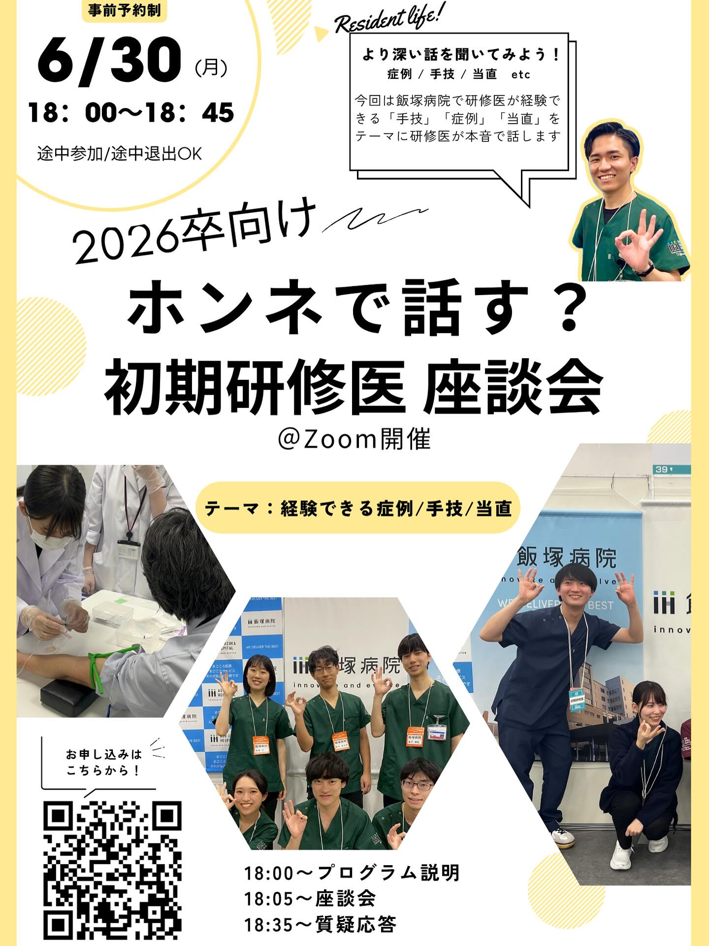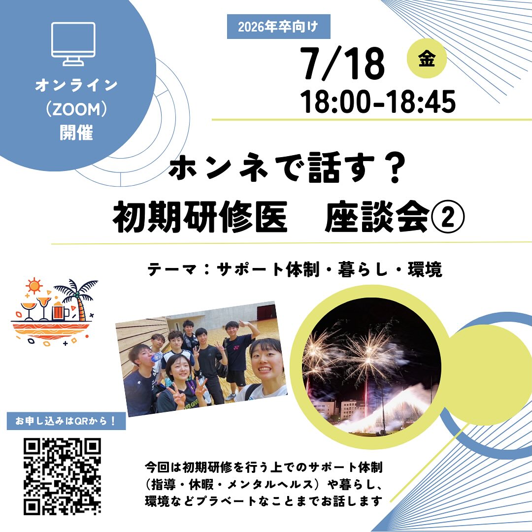 7月は第2弾として「ホンネで話す? ~初期研修医 座談会~」、テーマはサポート体制、生活、暮らしについてお話ししていただきます!
