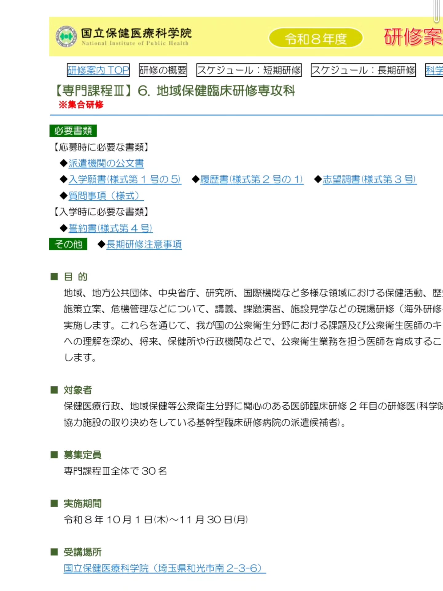 NIPH は日本の公衆衛生の中枢機関。当院のプログラムでは、J2の選択科(地域医療)で NIPHの「地域保健臨床研修専攻科」(2か月)に参加できます。