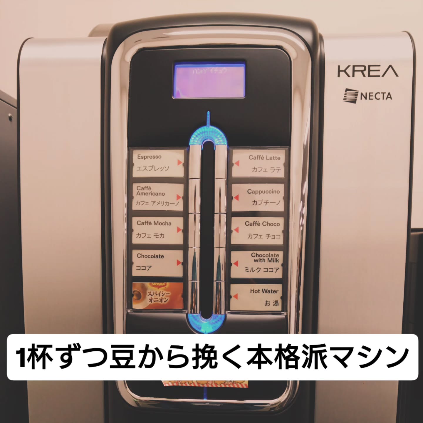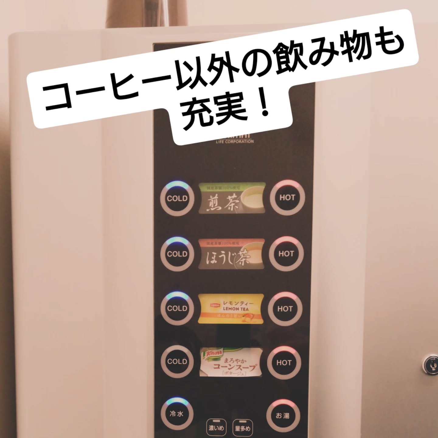 一杯ずつ豆から挽く豪華なコーヒーマシンをはじめ、緑茶、ほうじ茶、紅茶、小腹が空いたときにほっとできるコーンスープなど。
