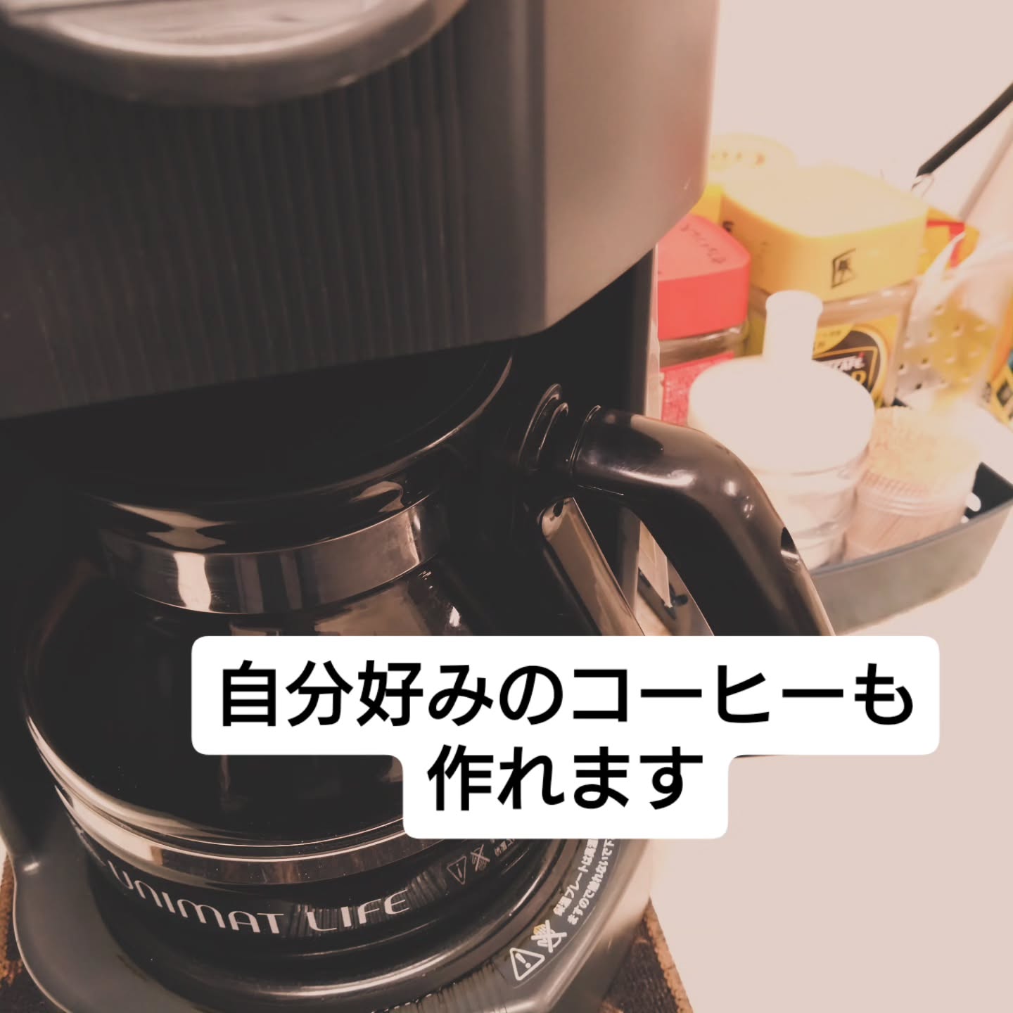 もちろん、コーヒーメーカーもあるので、たくさん飲みたいときにはこちらをどうぞ。ブラック?砂糖?クリーム?お好きな飲み方で!😊