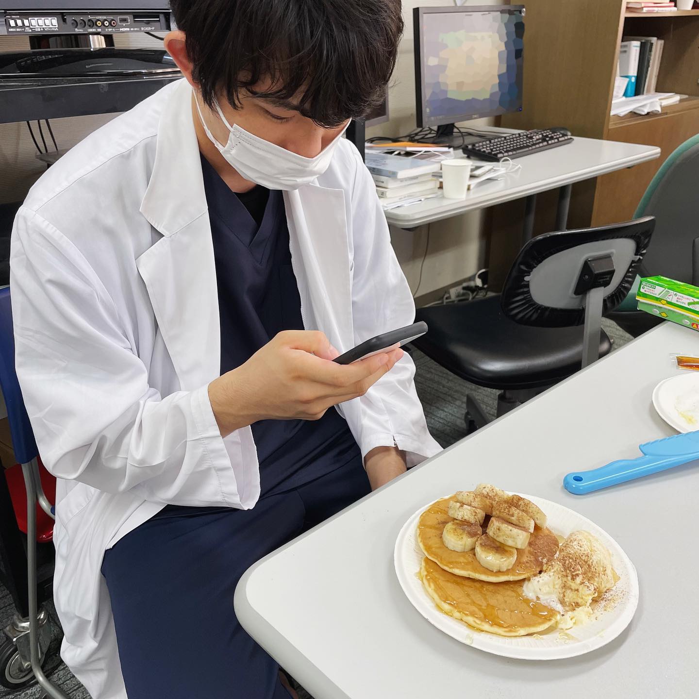 今朝方、医局でパンケーキを作っている研修医を発見🤓