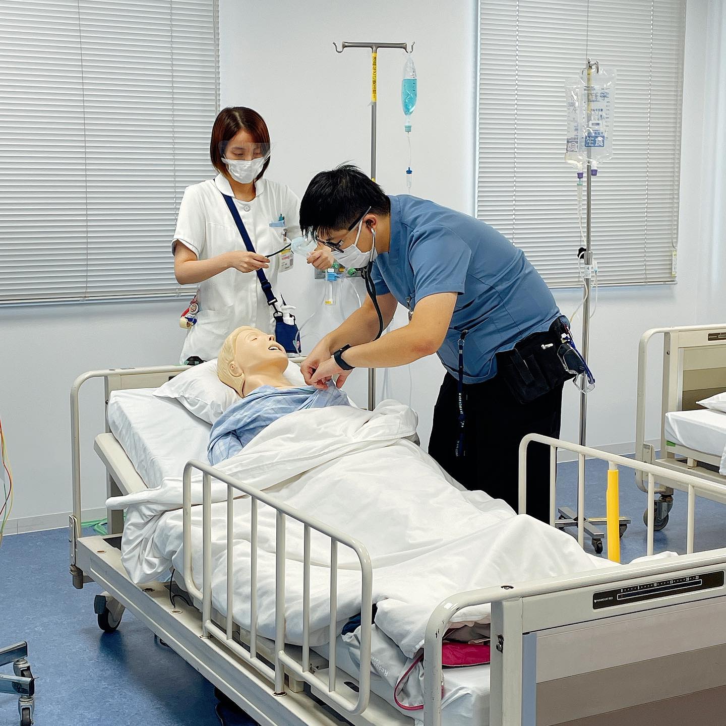 医師と看護師のクロストレーニングである夜間急変対応シミュレーションを行いました。ラーニングセンターに病室を再現し、病棟で夜間に起こり得るケースをシミュレーションしました。学習者は専攻医と看護師、そしてシミュレータを患者役として操作するのは事務スタッフ。
