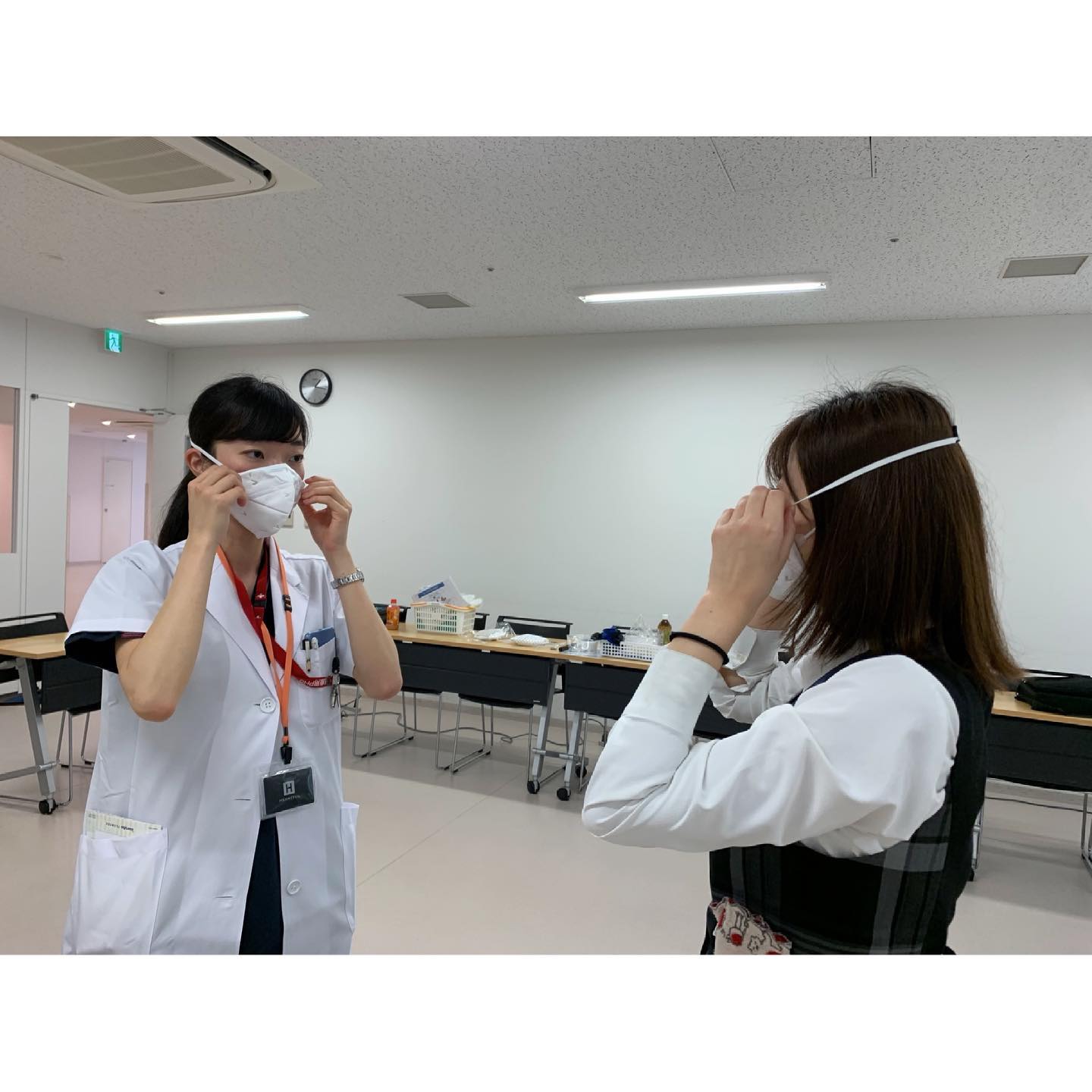 N95マスクの装着方法をレクチャーいただき、フィットテストを行なっている研修医の様子です。