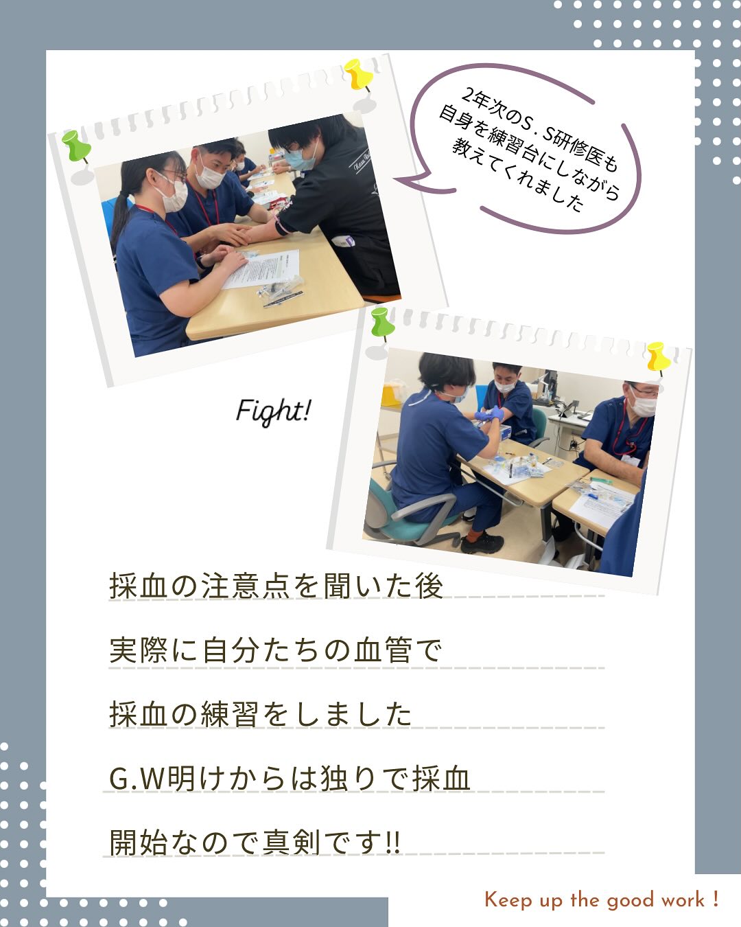 これから救急外来など、研修医でも患者さんの採血をさせていただく機会が増えるので、しっかりと採血できるようになりたいですね!