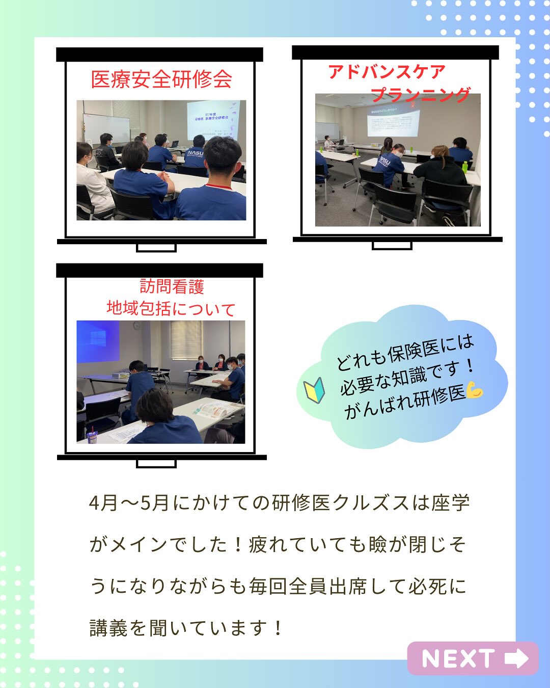 いつも私たちの投稿をご覧いただき、本当にありがとうございます。これからも研修医の日常や取り組みをお届けし、少しでも身近に感じていただけるよう努めてまいります。次の目標に向けて、今後ともどうぞよろしくお願いいたします🌿