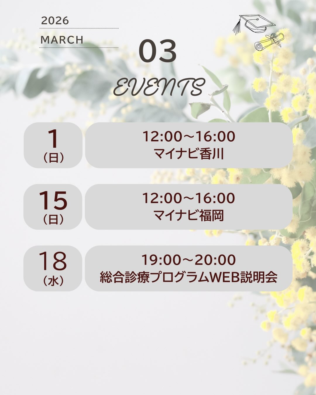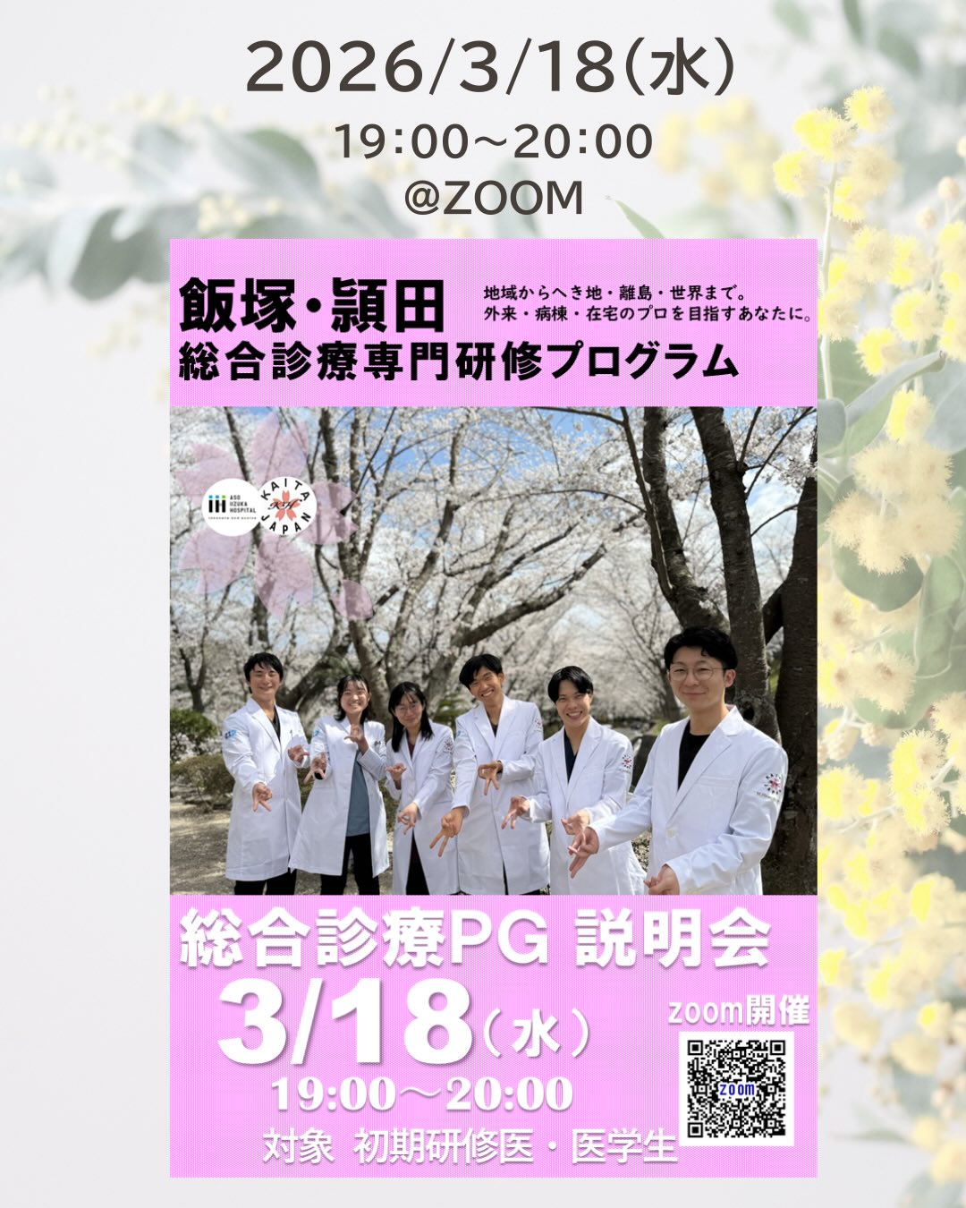 お知らせ! 2026年3月開催、出展予定のイベントです! 3月はマイナビ香川、福岡に参加しますのでぜひブースにお越しください! 3/18の総合診療プログラム説明会もまだまだ参加者募集中ですので奮ってご応募ください! プロフィールページのリンク (linktr.ee) より申込ページへアクセスできます @education_promotion_office #飯塚病院 #セミナー#教育推進本部#初期研修 #研修医