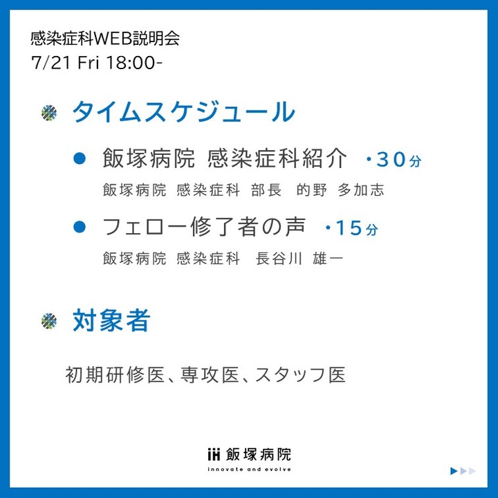 飯塚病院 感染症科WEB説明会 7月21日(金)18時- タイムスケジュール 飯塚病院 感染症科紹介・30分  飯塚病院 感染症科 部長 的野 多加志 フェロー修了者の声 ・15分  飯塚病院 感染症科 長谷川 雄一 対象者 初期研修医、専攻医、スタッフ医 ▼▼企画中のイベント、当院のSNSはこちらから▼▼ https://linktr.ee/AIHEPO #飯塚病院 #内科専門研修 #内科専門研修プログラム #感染症科 #感染症科医