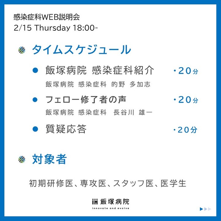 2024.2.15(木)18-19時 飯塚病院 感染症科 説明会を開催します! 開催時間は、感染症科説明(20分)、フェロー修了者の声(20分)と質疑応答 約1時間で、対象は、研修医、専攻医、スタッフ医、医学生です。 内科専門研修志望で、感染症科に興味のある方、是非、ご参加をお待ちしています! ▼▼お申し込みはこちらから▼▼ https://aih-net.com/resident/event/ ▼▼企画中のイベント、当院SNSはこちらから▼▼ https://linktr.ee/AIHEPO @education_promotion_office その他、当院専門研修に関するお問い合わせは、 適宜受付けておりますので、お気軽にお声かけください。 #飯塚病院 #飯塚病院 感染症科 #飯塚病院 内科専門研修プログラム #内科専門研修